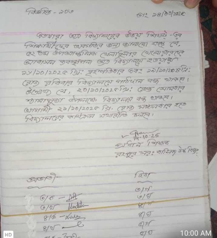 | 23/10/2025 | আন্দোলনের কারণে বিদ্যালয়ে পাঠদান না হওয়ায়, আগামী শনিবার হইতে বার্ষিক পরীক্ষার আগ পর্যন্ত প্রতি শনিবার যথারীতি বিদ্যালয় চলিবে। | ডাউনলোড |